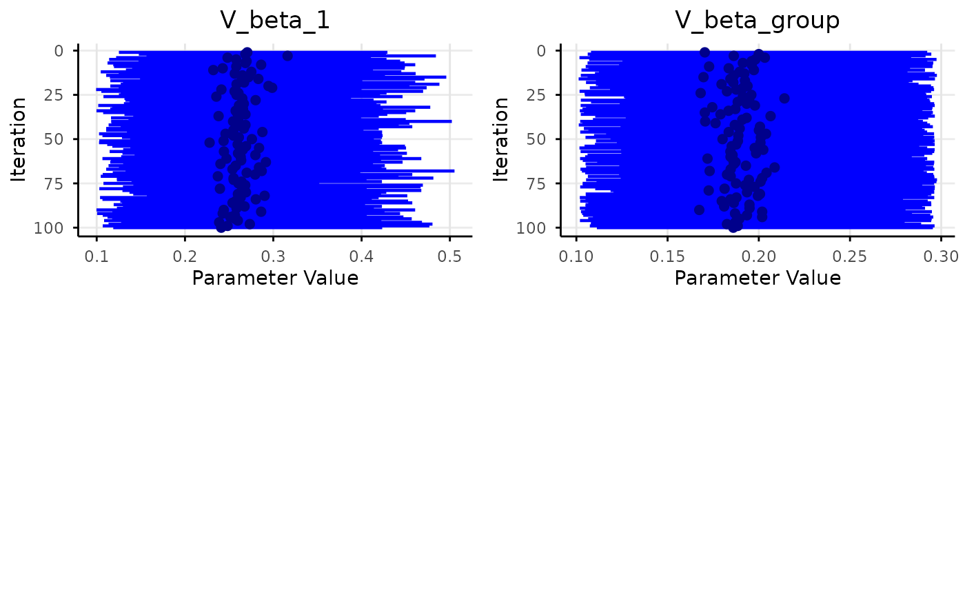Create forest plots showing parameter ranges across resample iterations. Each iteration is displayed as a horizontal line with quantile intervals.